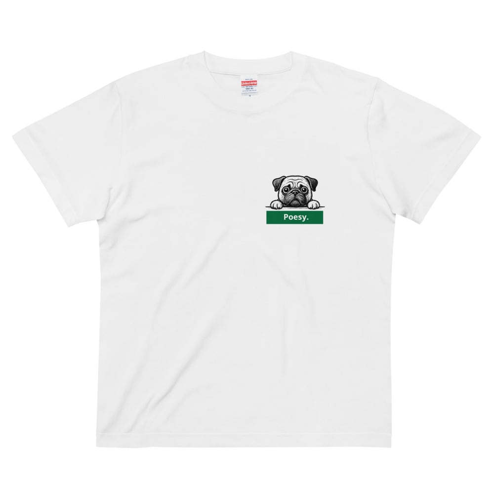 愛らしいパグくんが、ポイジーの看板を持っています。